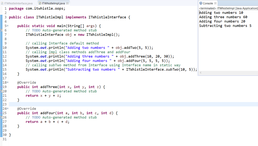 System.out.println("Subtracting two numbers " + ITWhistleInterface.subTwo(10, 5));