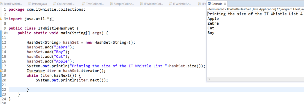 System.out.println("Printing the size of the IT Whistle List "+hashSet.size());