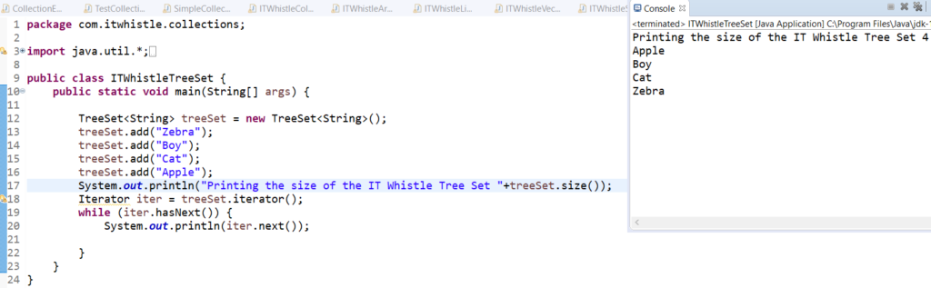 System.out.println("Printing the size of the IT Whistle Tree Set " + treeSet.size());