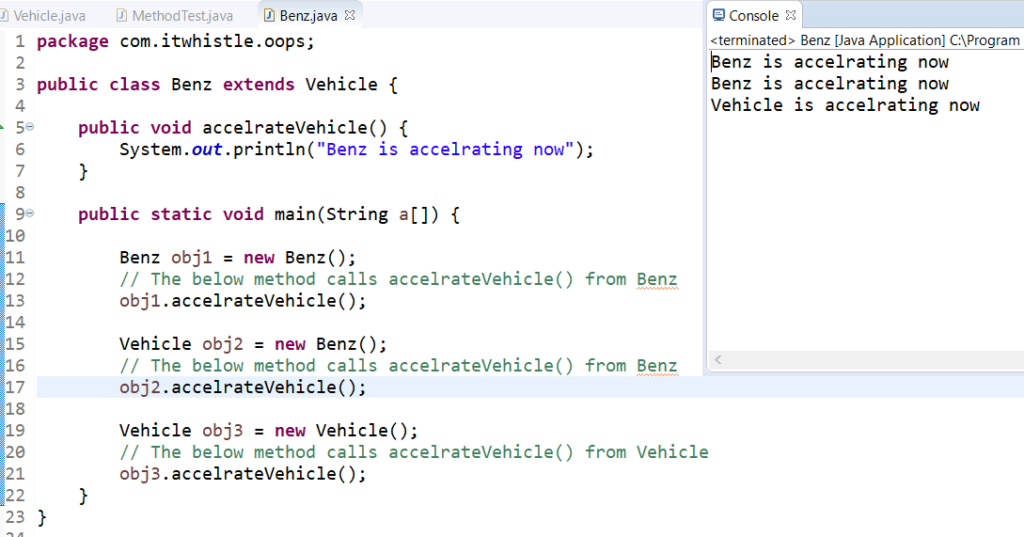 Therefore in the below example it calls the same method “accelrateVehicle()” is written with different print statement.