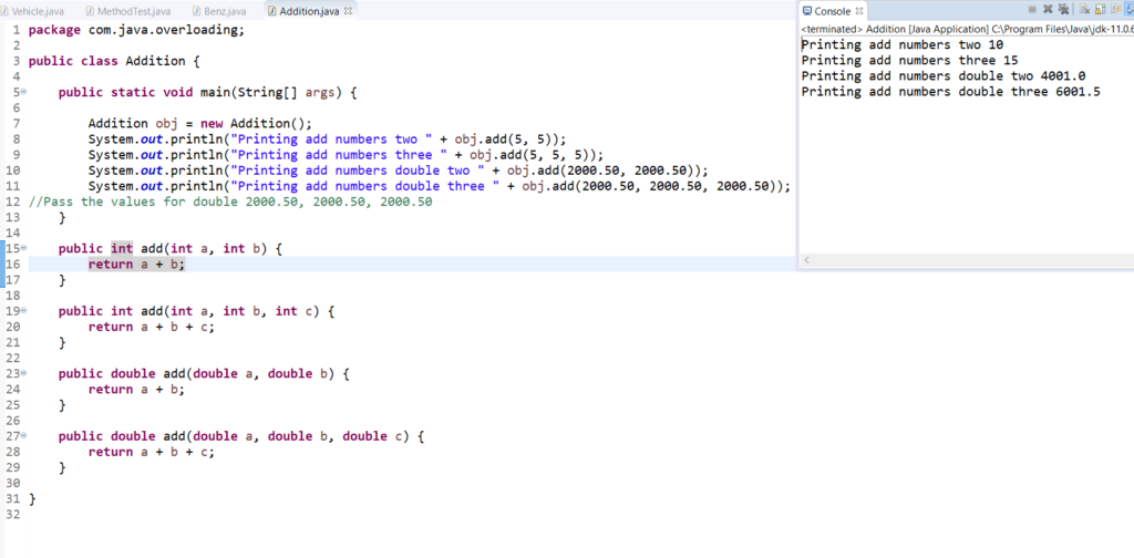 Therefore in the below example it calls the add method based on the parameters passed, it throws an error compile time if you use same method name and same parameters